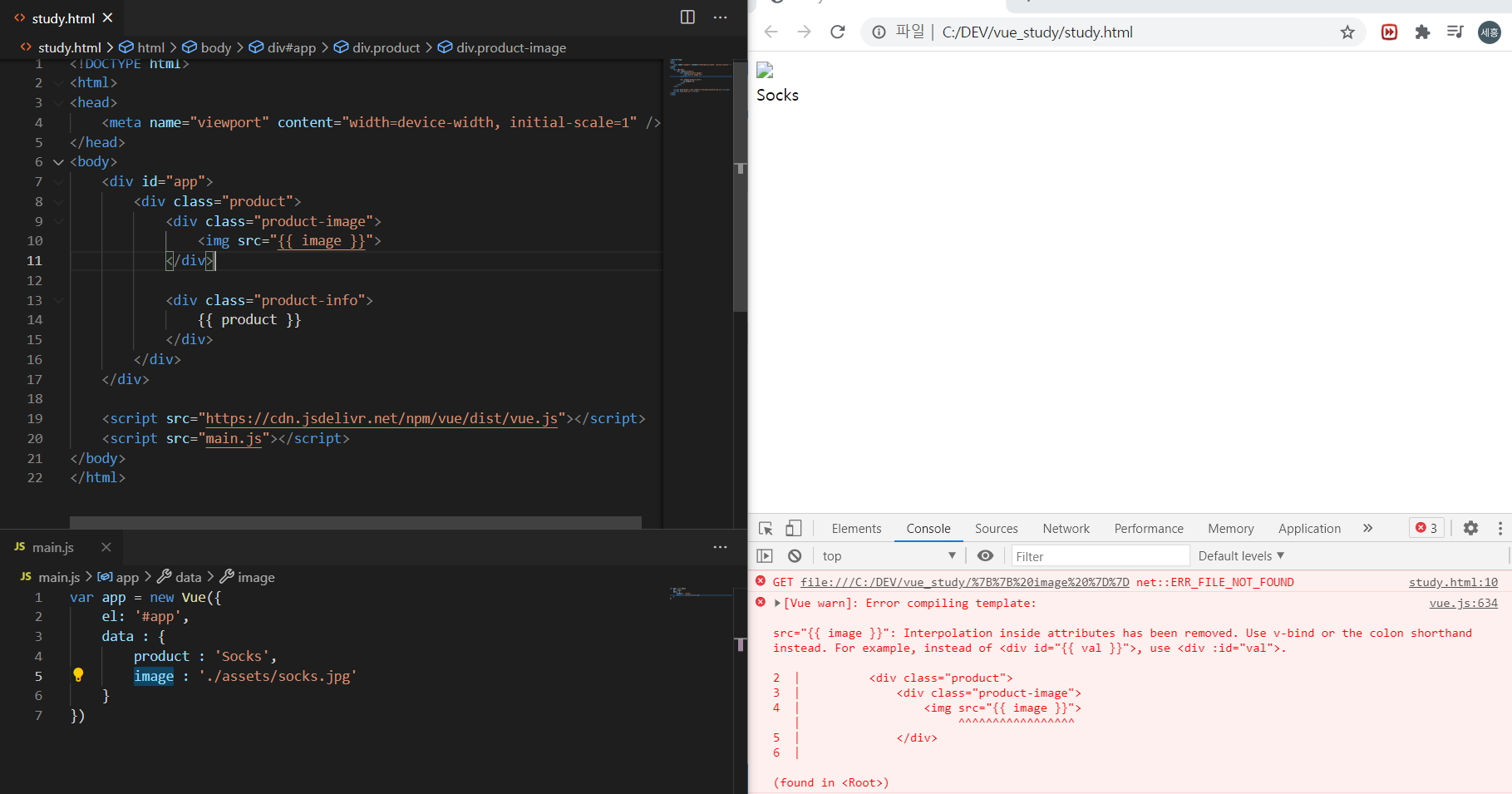 study.html 파일을 만들고, vue instance를 선언할 별도의 main.js 파일을 만들어서 import 하는 아래의 예제를 참고하면 아주 간단한 방식으로 instance 생성 및 이를 통해 값을 표현하는 방식을 볼 수 있다.