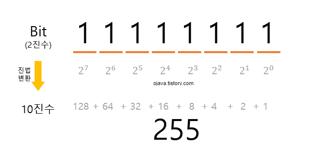 최댓값 11111111 = 128+64+32+16+8+4+2+1 = 255