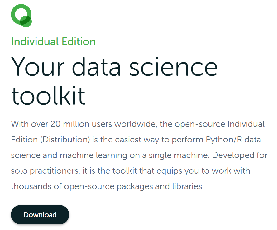 아나콘다는 수천개의 오픈소스 패키지와 라이브러리를 포함한 배포판으로, Python / R Data science 및 머신 러닝을 수행하는 가장 쉬운 방법이라고 써있다. 2천만명 이상이 이 툴을 사용하고 있다고 하는데, 이제 한 명 더 추가되었다.