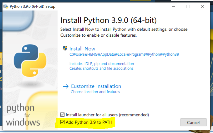 첫 화면에 Add Python 3.9 to PATH 라는 설정이 있는데 꼭 체크해주자.