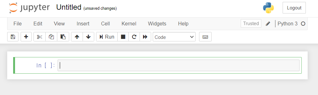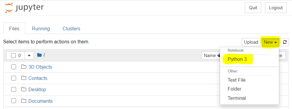 Jupyter Notebook에서 Python 파일을 생성하여 개발을 진행하려면 상단의 New 버튼을 클릭하여 파일을 생성하겠다고 선택하고, 유형으로 Python 3를 선택하면 된다.