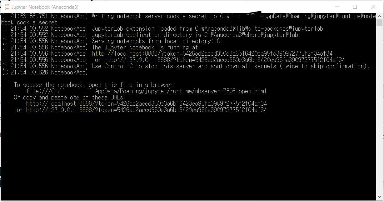 Jupyter Notebook 실행 후, 자동실행 이런게 나오길래 이상한거 실행될까봐 무시했는데 위와 같이 로컬서버 페이지 접속하는 링크가 열린다. 혹시라도 안열린다면 당황하지말고 Jupyter Notebook 화면에 떠있는 File browser 경로 혹은 URL 중 아무거나 골라서 실행시키면 열린다.