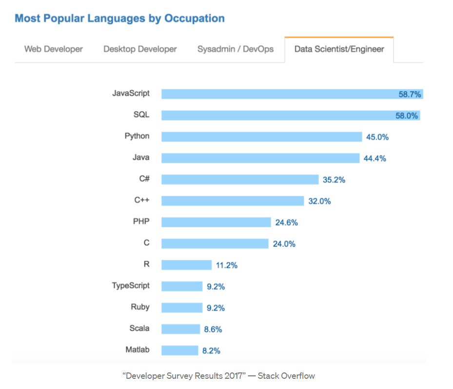 데이터 분석을 진행하는 데이터사이언티스트, 엔지니어가 가장 많이 사용하는 언어에 대해 조사한 통계 결과에서 화면에서 조작하기 위한 JavaScript와 데이터 조회를 위한 SQL문을 제외하고 개발언어로 Python이 가장 높은 순위로 사용되고 있다.
