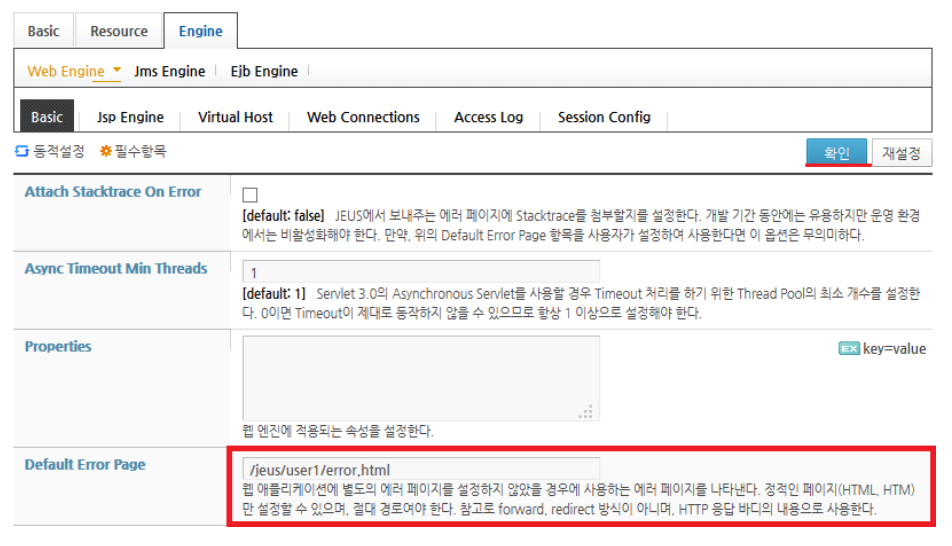 설정된 기본 오류 페이지가 있는지 확인하는 법은 [Engine] > [Web Engine] > [Basic] 메뉴를 선택한다.