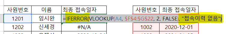 IFERROR로 기존에 작성한 VLOOKUP 함수를 감싸는 형태로 작성할 거고 이렇게 해도 잘 나오던 결과는 그대로 잘 나오며, 문제가 있는 데이터만 원하는 형태로 바뀌어서 나온다.