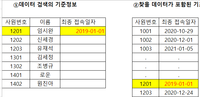 일치하는 값이 있으면 해당 행에서 최종 접속일자 값이 포함된 두 번째 열의 데이터를 읽어들이는 것