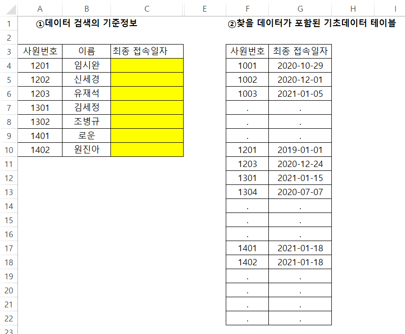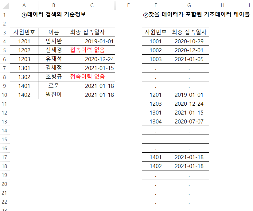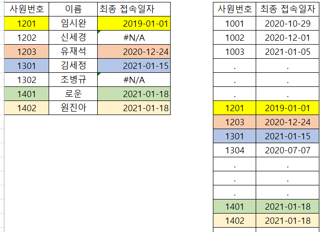 일치하는 값이 있으면 해당 행에서 최종 접속일자 값이 포함된 두 번째 열의 데이터를 읽어들이는 것