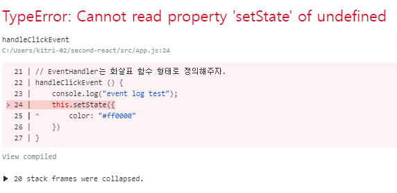 함수 내부의 this를 찾기 때문에 원하는 내용을 찾아오지 못하므로 아래와 같은 에러를 만날 수 있음