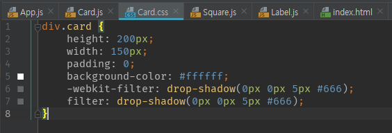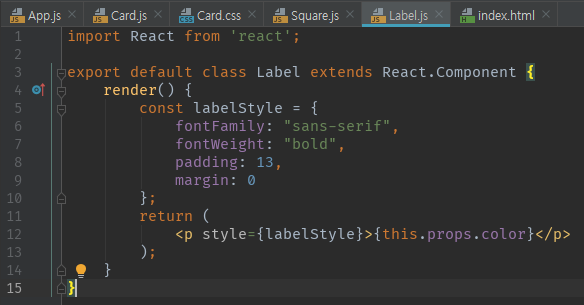 카드 구조는 색상이 나오는 square 부분과 무슨 색인지 표시해주는 label 영역으로 구성된다. 그리고 이를 Card라는 부모 컴포넌트에서 부르는 형태로 아래와 같이 만들었다.