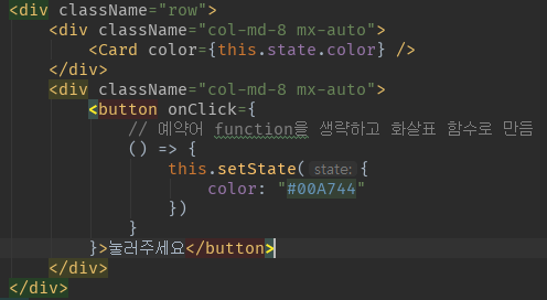 위 Card 색상 바꾸기를 위한 눌러주세요 버튼에 추가했던 onClick 함수 선언방식을 보면 function을 생략하고 화살표 함수로 정의해두었다.
