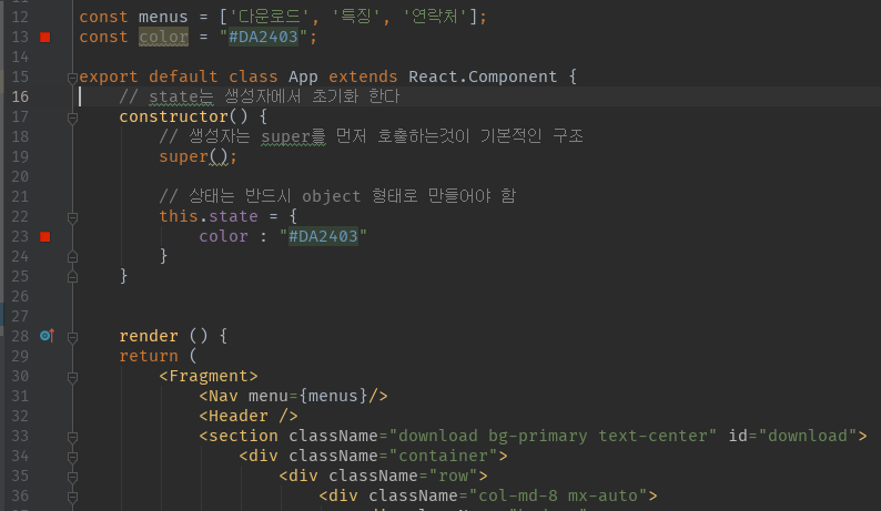 - 우선 state는 생성자(constructor)에서 초기화한다.