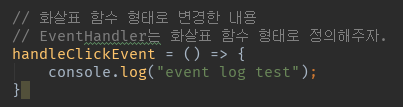그리고 이벤트 함수를 별도 정의하는 경우도, 아래와 같이 화살표 함수로 정의하는 것을 권고한다.