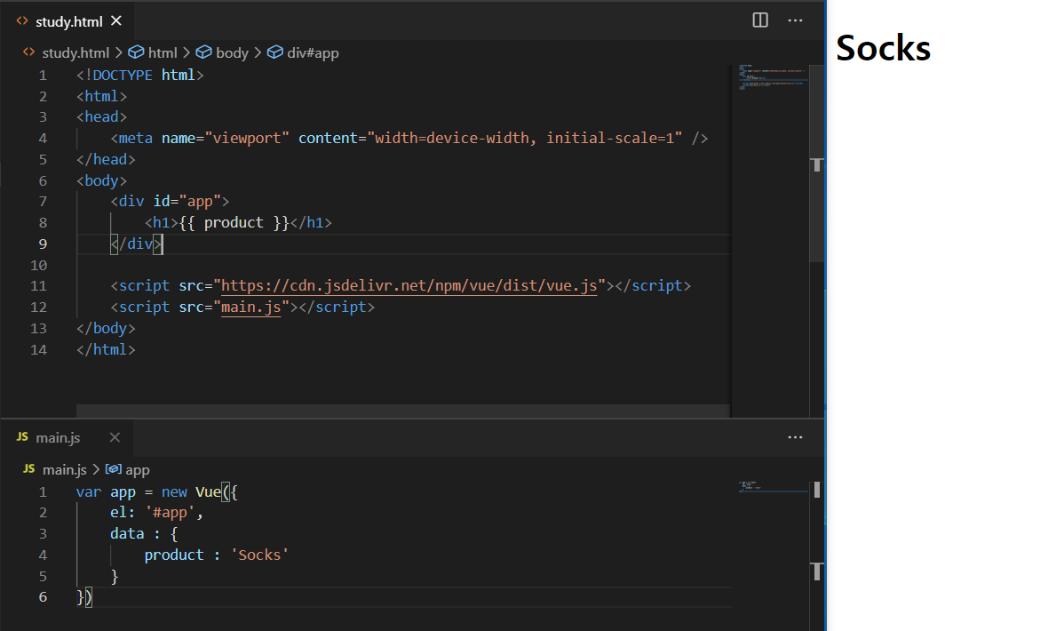 product : 'Socks' // vue instance에서 불러들일 데이터