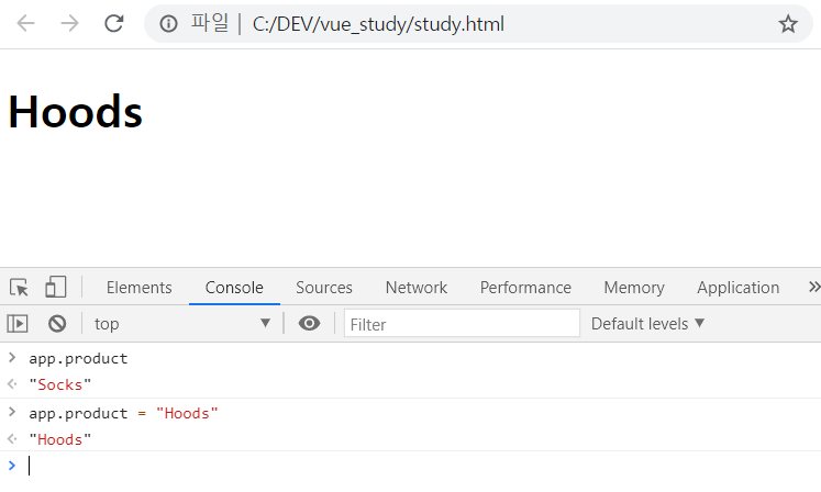 app.product를 입력하면, 기존에 작성했던 Socks를 불러오는 것을 볼 수 있고 이를 변경해서 선언하니 화면에 변경된 product인 Hoods가 뜬다.