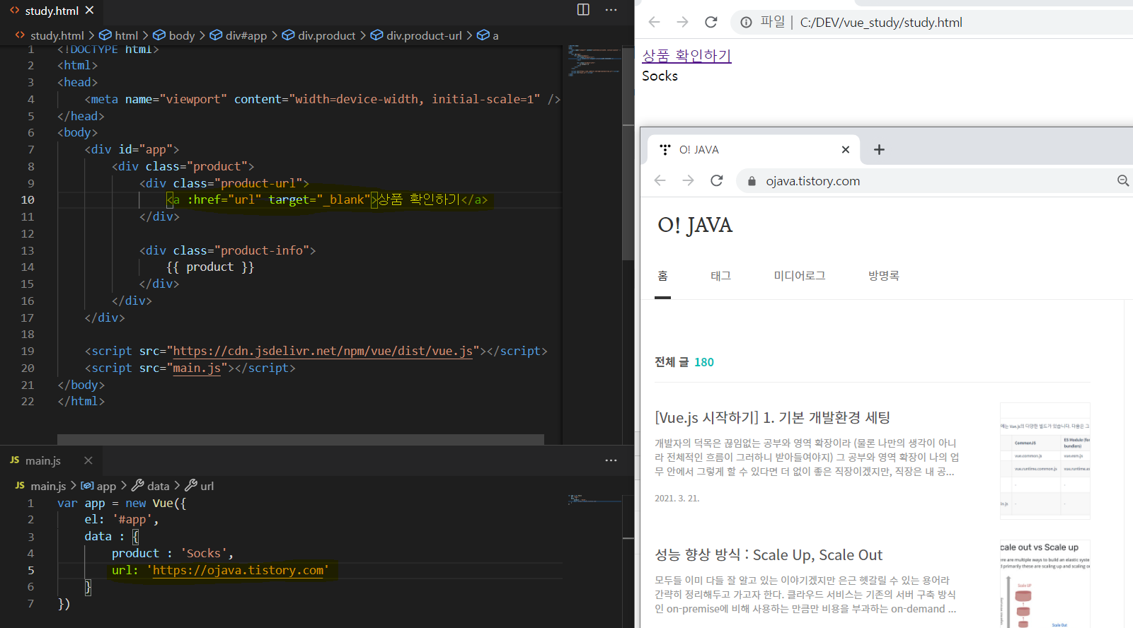 study.html 파일을 만들고, vue instance를 선언할 별도의 main.js 파일을 만들어서 import 하는 아래의 예제를 참고하면 아주 간단한 방식으로 instance 생성 및 이를 통해 값을 표현하는 방식을 볼 수 있다.