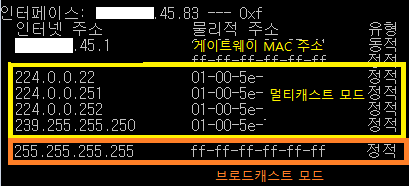 12자리 구성의 MAC 주소 중 맨 앞의 6자리는 제조회사 번호라고 했었는데 멀티캐스트 MAC 주소는 제조회사번호가 01-00-5E로 시작한다.
