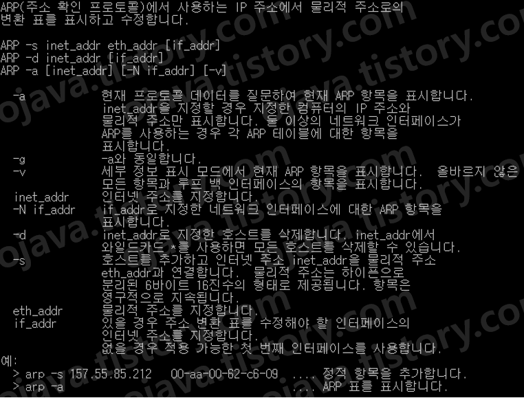 ARP (주소 확인 프로토콜)에서 사용하는 IP와 MAC 주소의 맵핑 테이블을 볼 수 있는 명령어