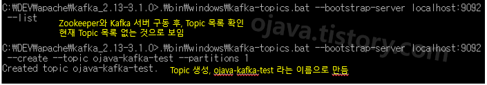 $KAFKA_HOME/bin/kafka-topic.sh --create --topic ojava-kafka-test --bootstrap-server localhost:9092 --partitions 1 - Topic 목록 확인