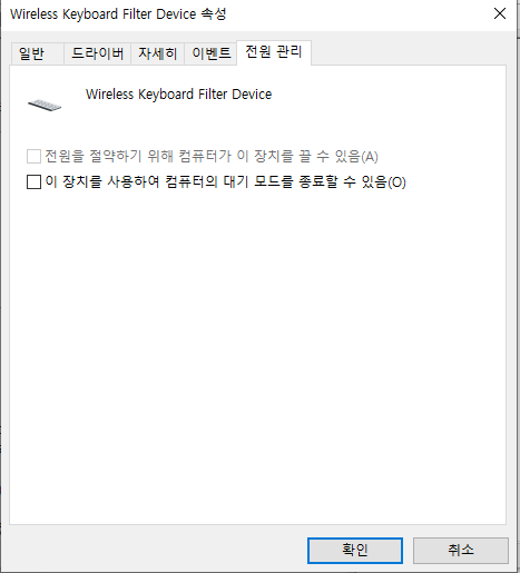 키보드 > 속성 > 전원 관리에서 모든 값을 체크하지 않음 상태로 두고 '확인'