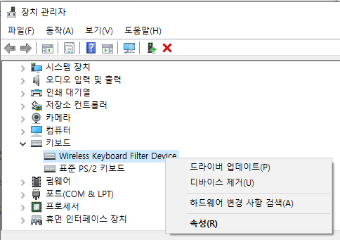 키보드 > 속성 > 전원 관리에서 모든 값을 체크하지 않음 상태로 두고 '확인'