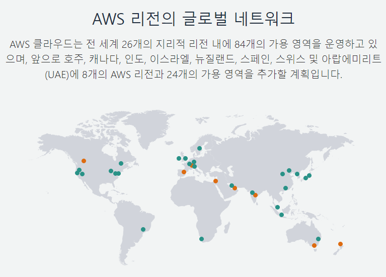 AWS에서는 2022년 기준 전 세계 26개의 리전에 84개의 가용 영역을 운영하고 있다고 한다.