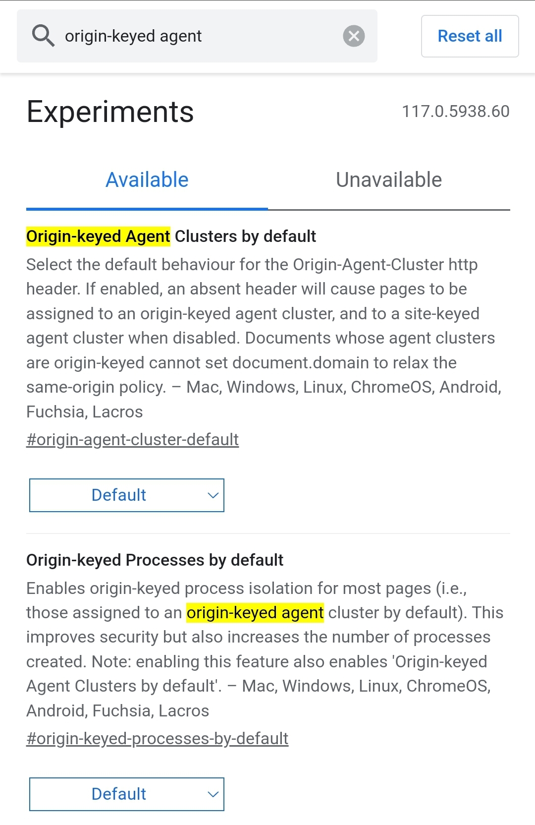 또는 chrome://flags/#/origin-agent-cluster-default 로 접속 시 바로 해당 설정으로 바로 가기 연결된다.